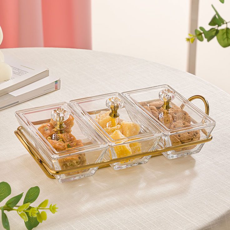 جنس کاسه ها شیشه ،جنس درب اکریلیک وجنس استند فلز است. این محصول مناسب پذیرایی وسرو شکلات ،نقل و… می باشد.